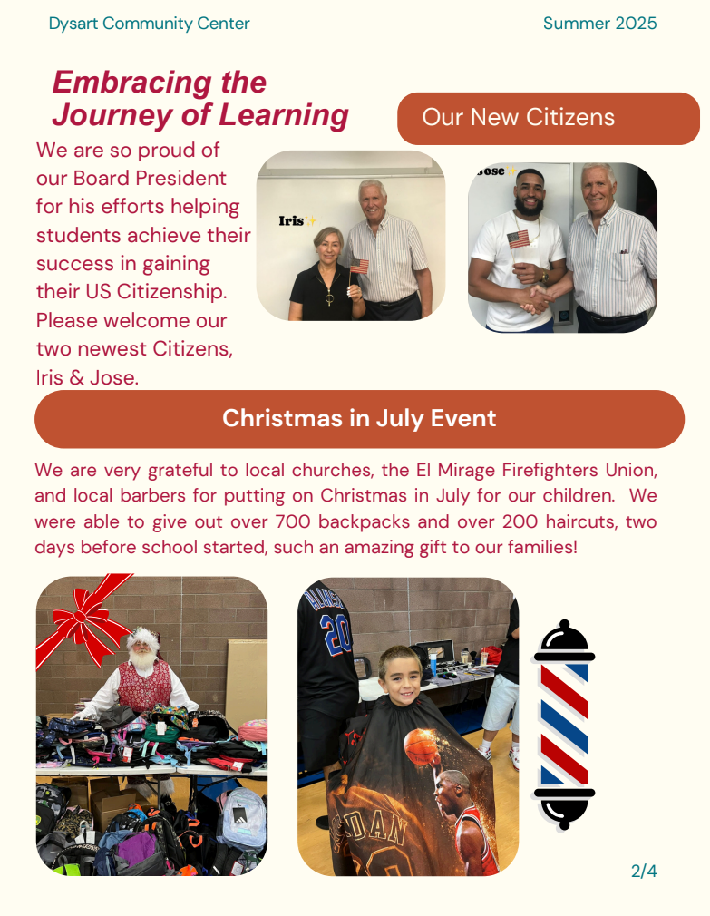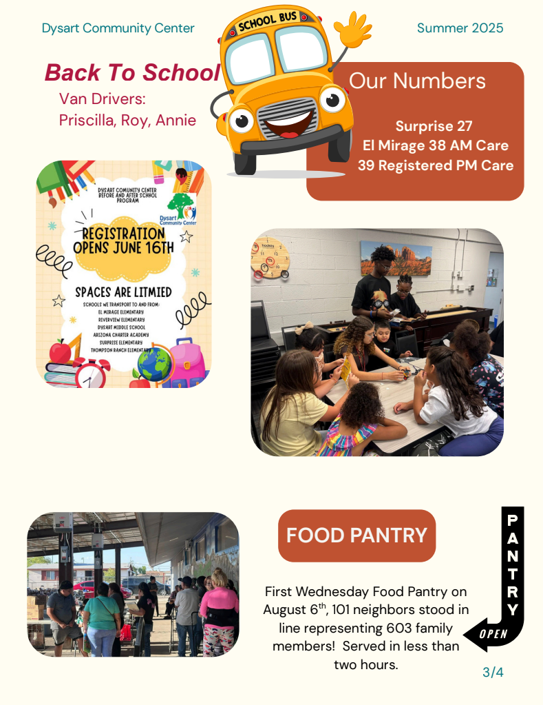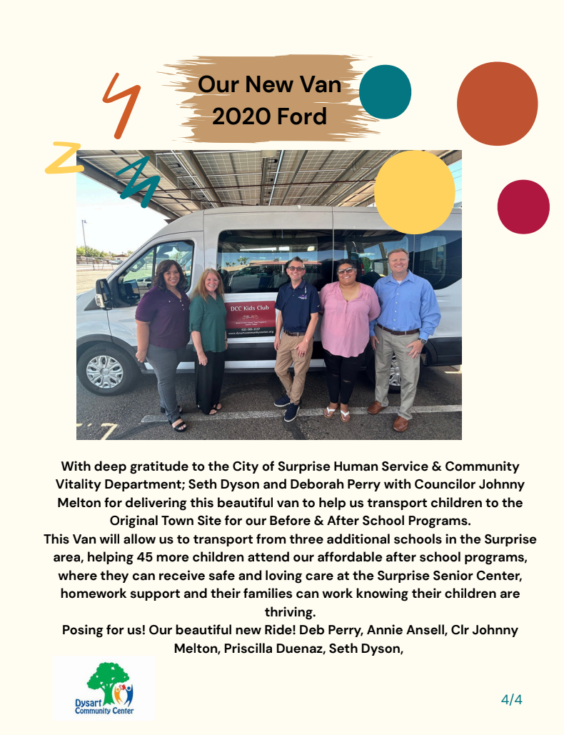 Both of these donations will go to support all of our programs as well as our flagship - the Kids Club Surprise. KCS established and funds the Surprise branch of the Dysart Community Center’s youth programming for before and after school care. Funds are spent on the portion of the program hosted within the city of Surprise. Hosted in the Original Town Site, it currently serves 27 Surprise children - allowing their families the breathing room to work without worrying about childcare.